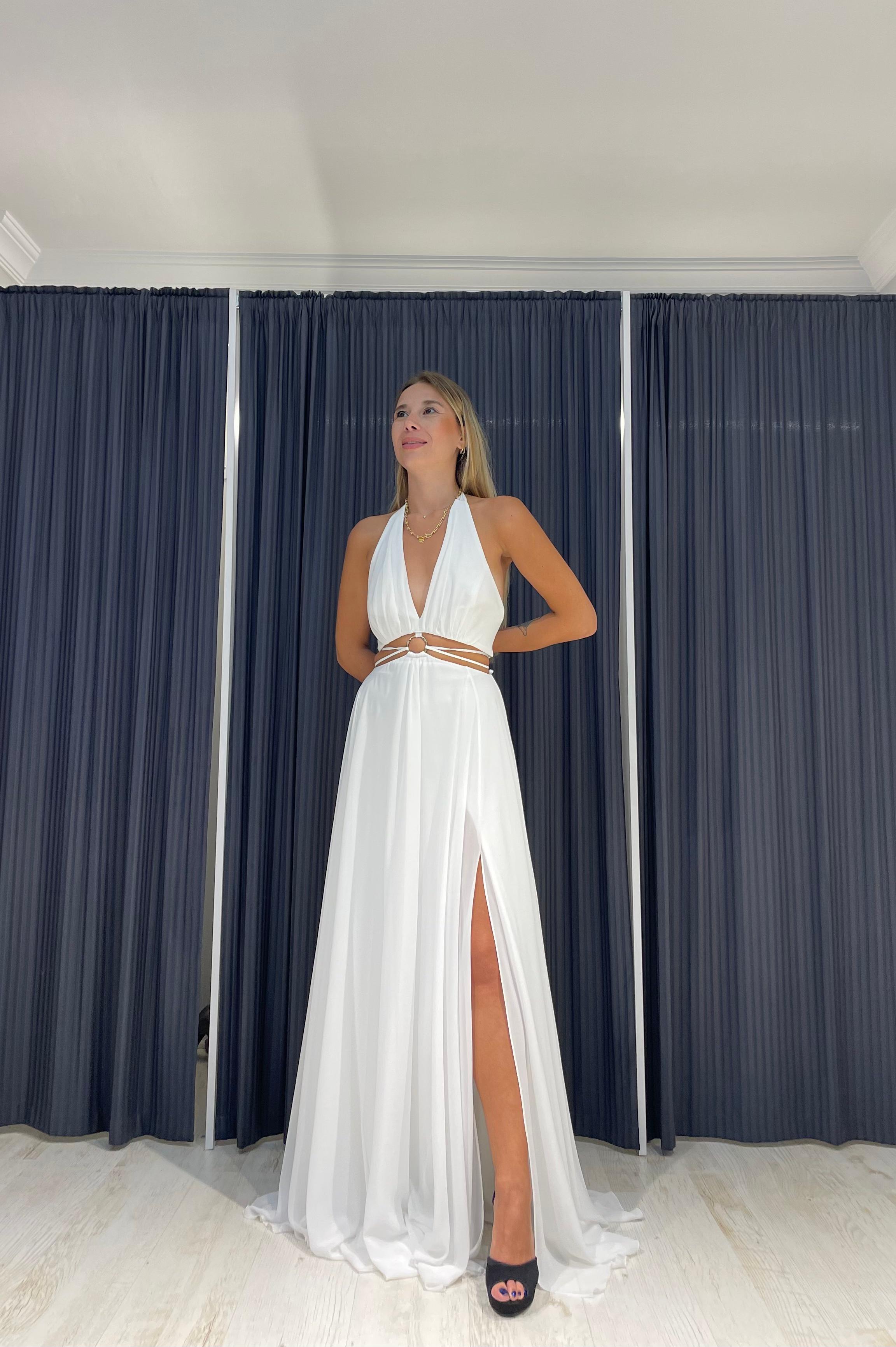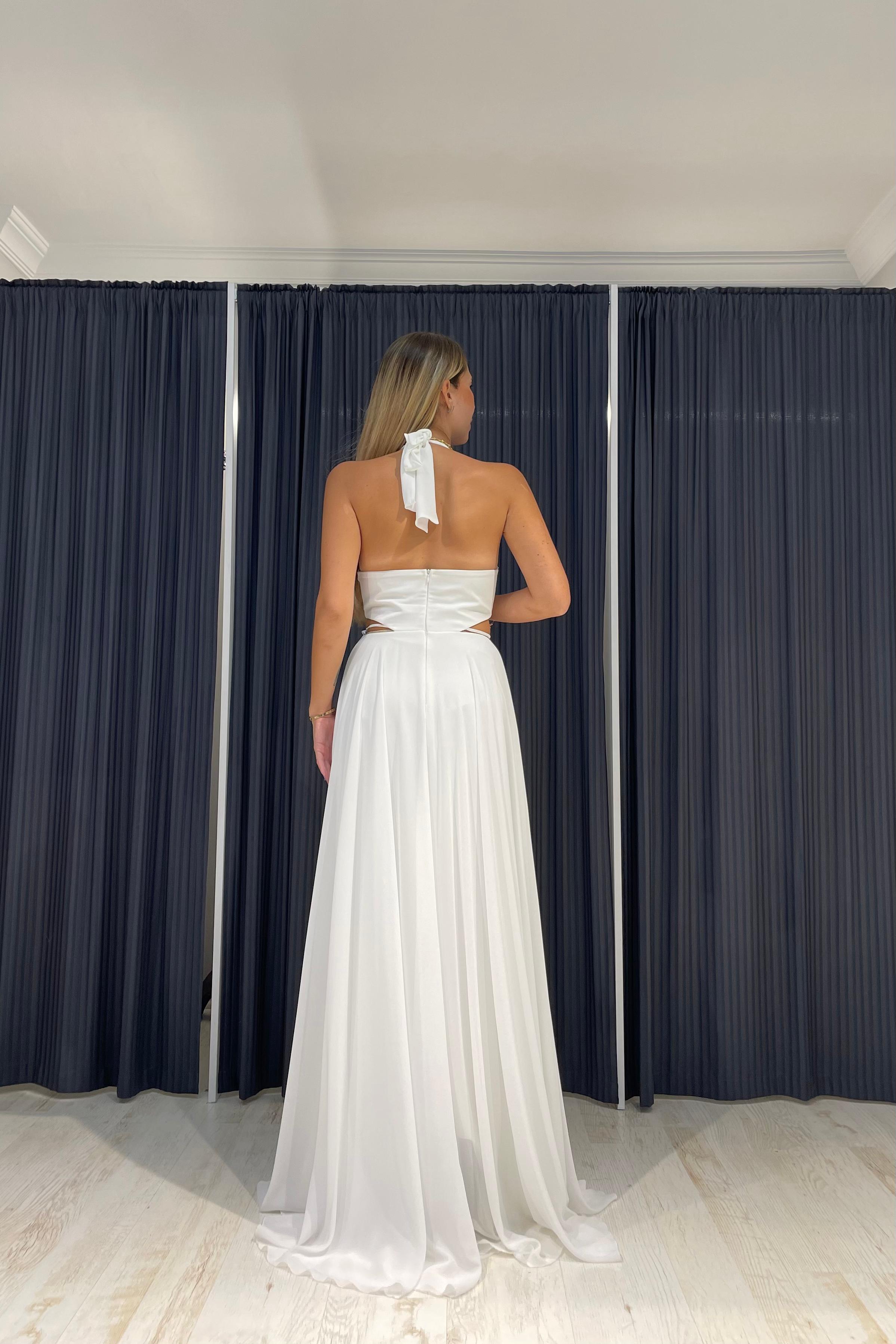 Boyundan Bağlamalı Beli Pencere Detaylı Tokalı Şifon Elbise