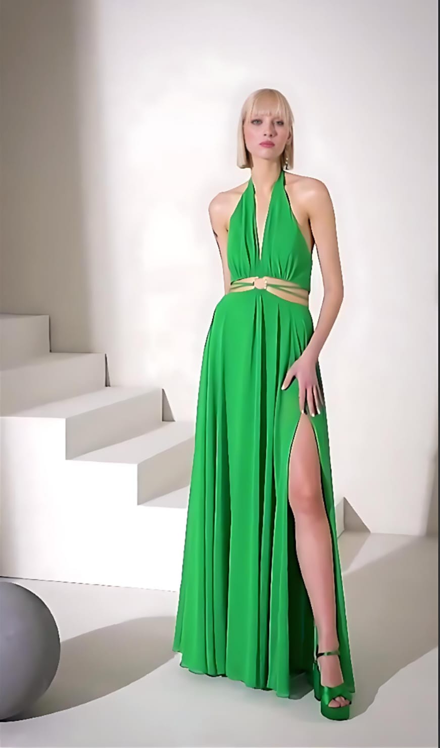 Bu elbise, vücudu saran kesimi ve boyundan bağlamalı beli sayesinde vücut hatlarınızı kusursuz bir şekilde ortaya çıkarır. Özellikle bel bölgesindeki tokalı detay, elbisenin etkileyici bir görünüme sahip olmasını sağlar.