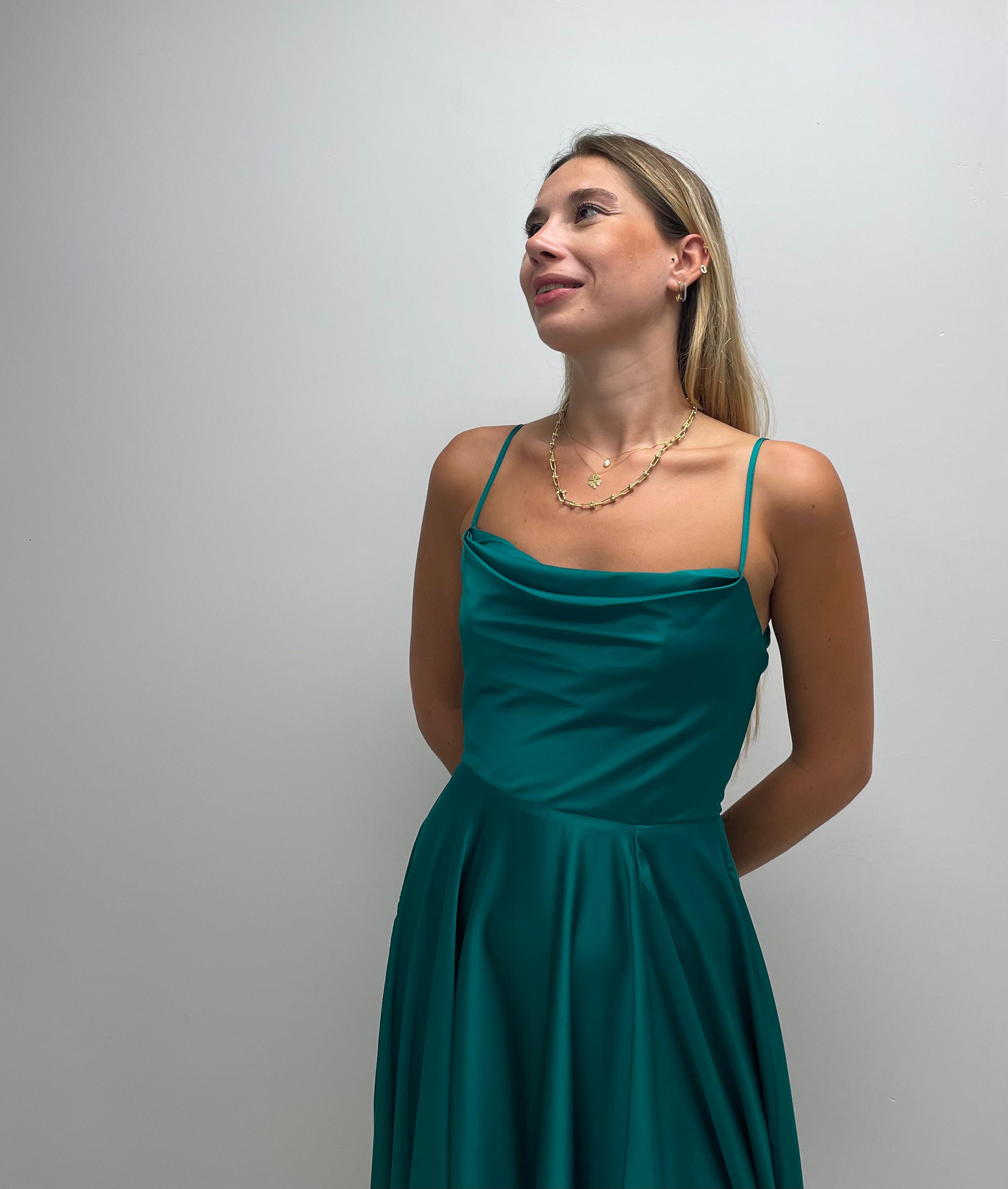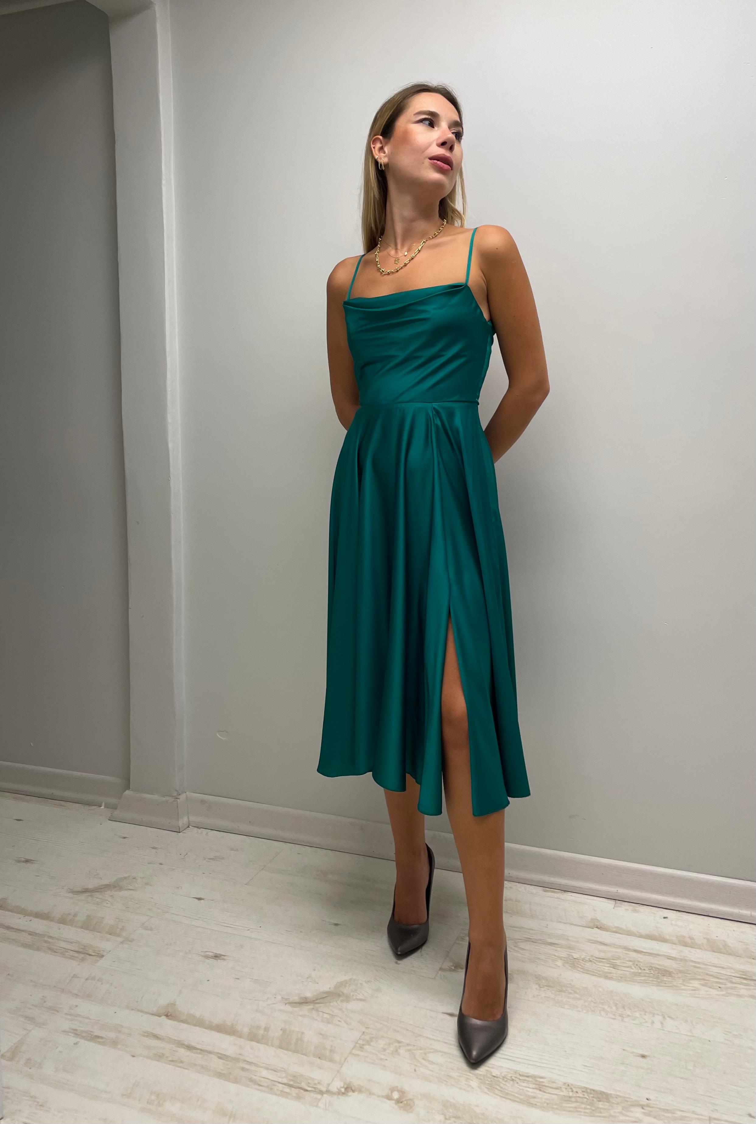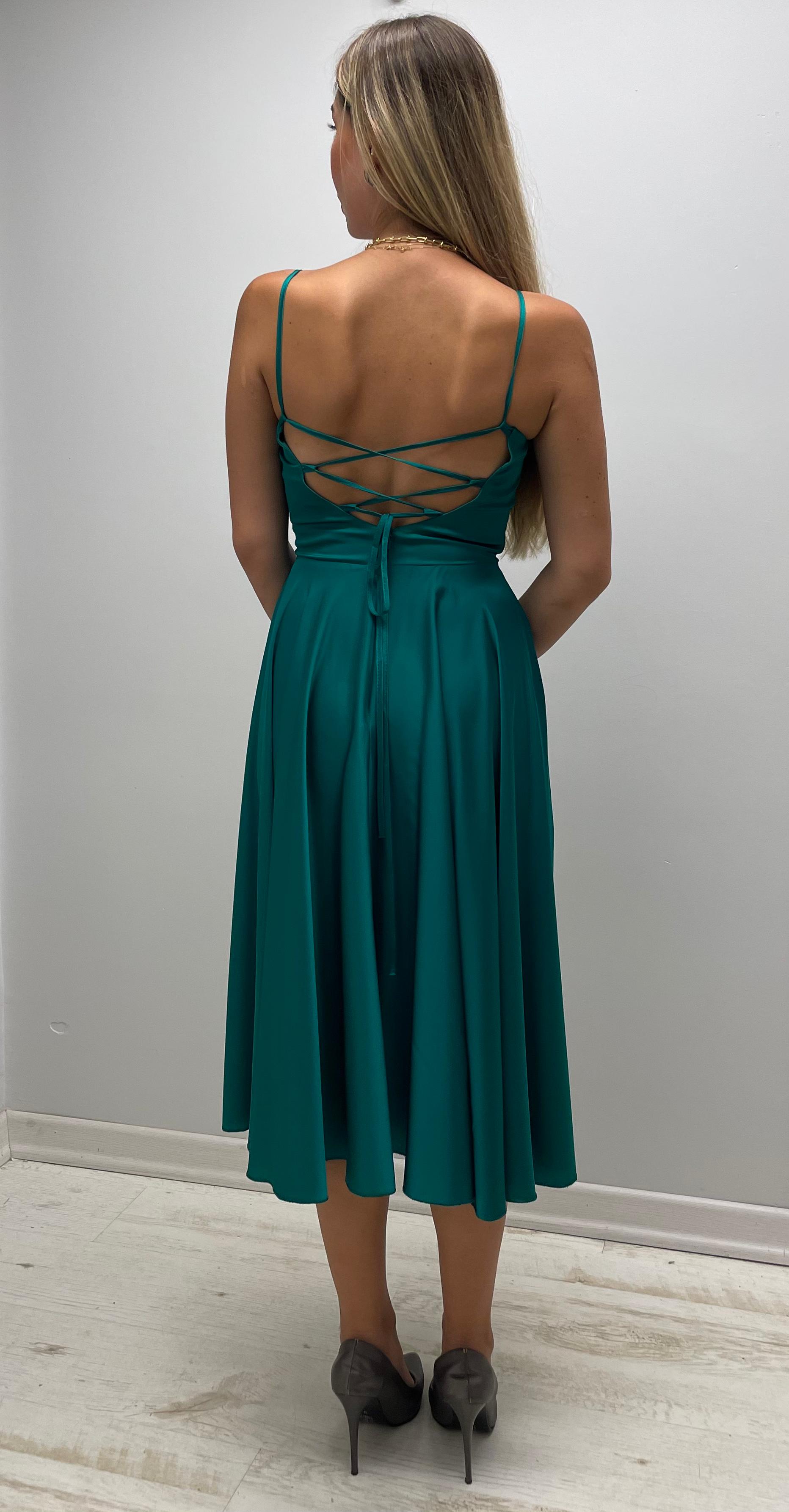 Degaje Yaka Sırtı Bağlamalı Saten Midi Elbiseyi topuklu ayakkabılarla şık bir akşam yemeğinde, istemenizde, söz/nişanınızda veya davetlerde rahatlıkla tercih edebilirsiniz. Ayrıca, elbisenin kaliteli ve dayanıklı kumaşı sayesinde uzun yıllar boyunca kullanabilir, gardırobunuzun vazgeçilmez parçalarından biri haline getirebilirsiniz.