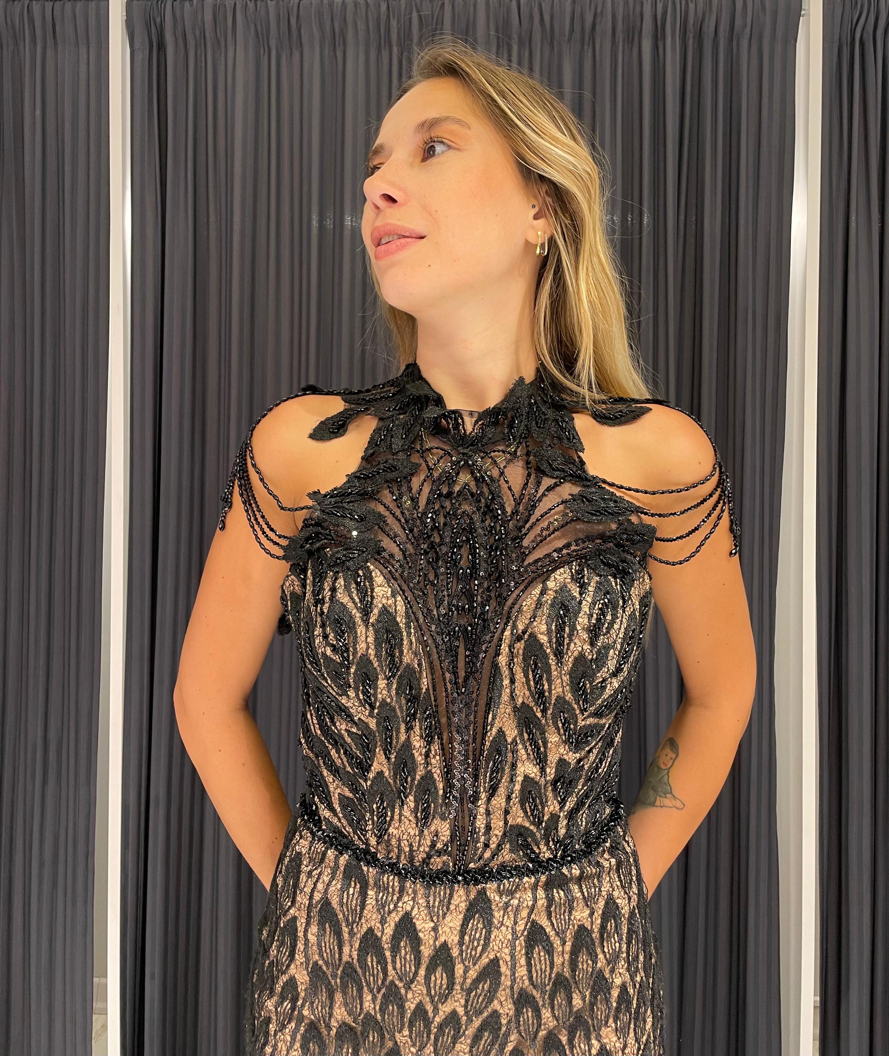 Omzu ve Sırtı Boncuk İşlemeli Dantel Detaylı Balık Elbise