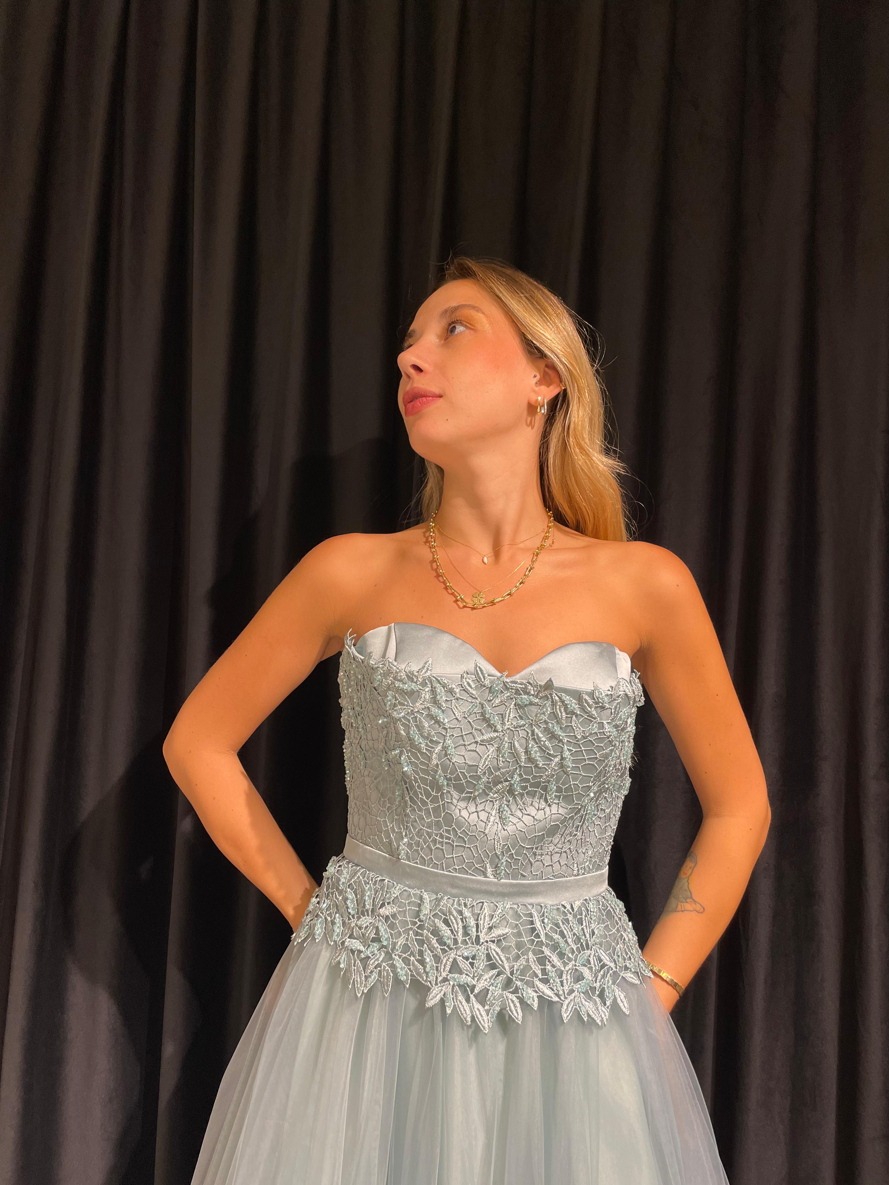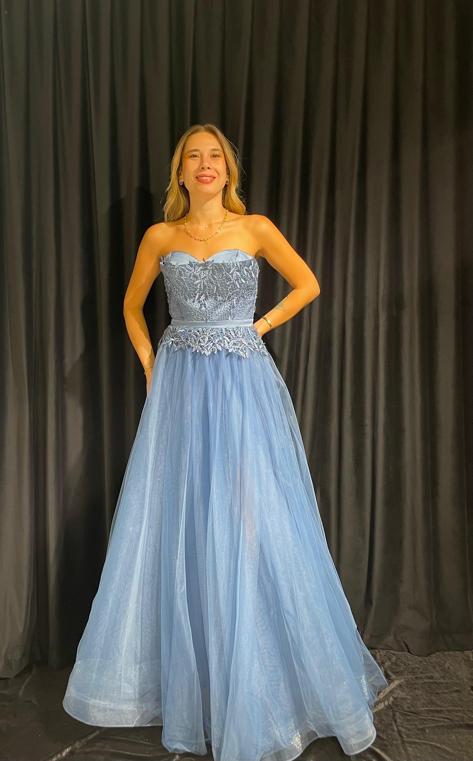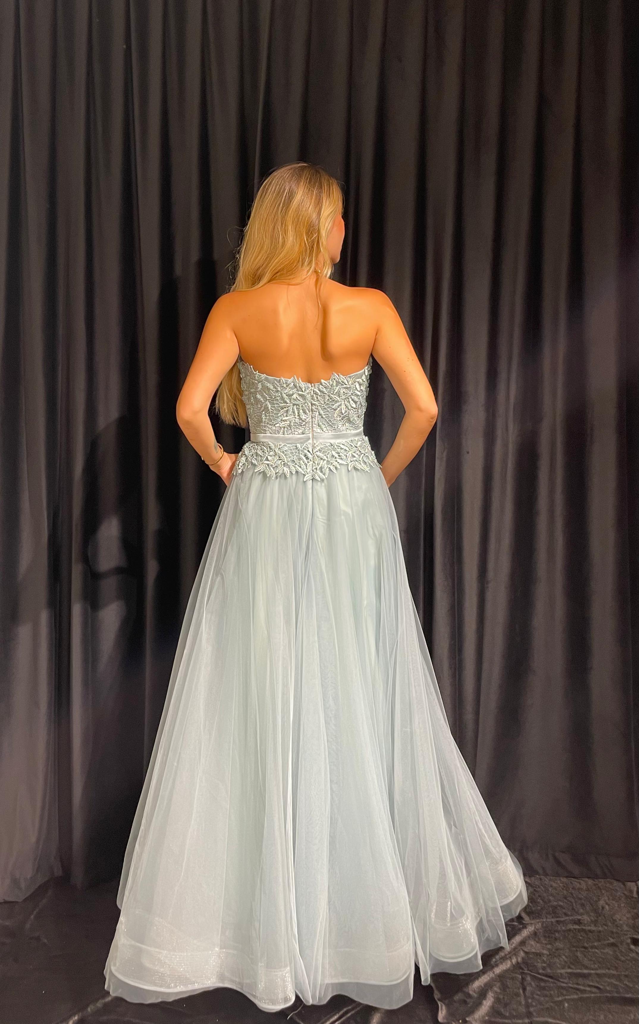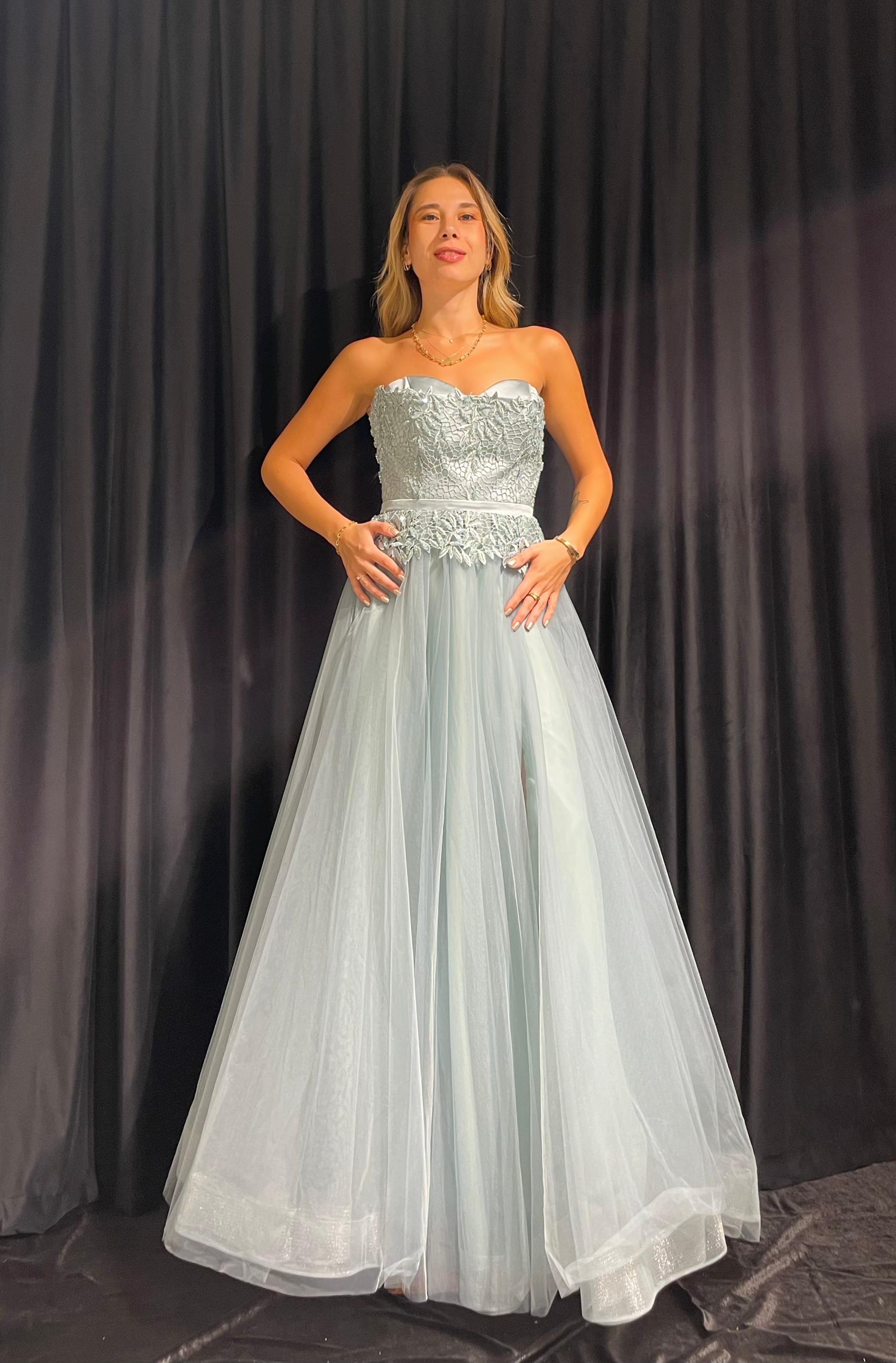 Straplez İşlemeli Gizli Yırtmaçlı Tül Elbise
