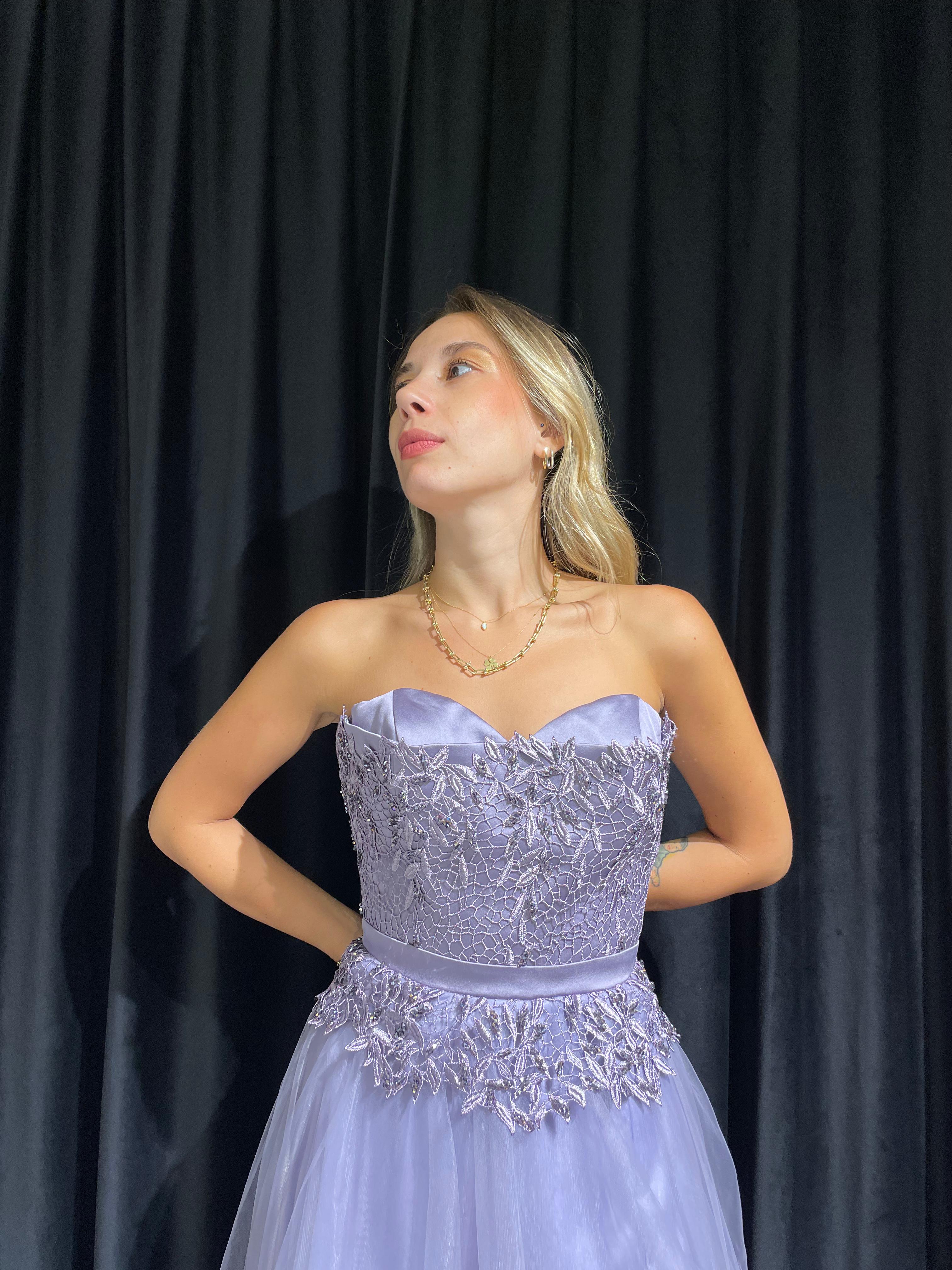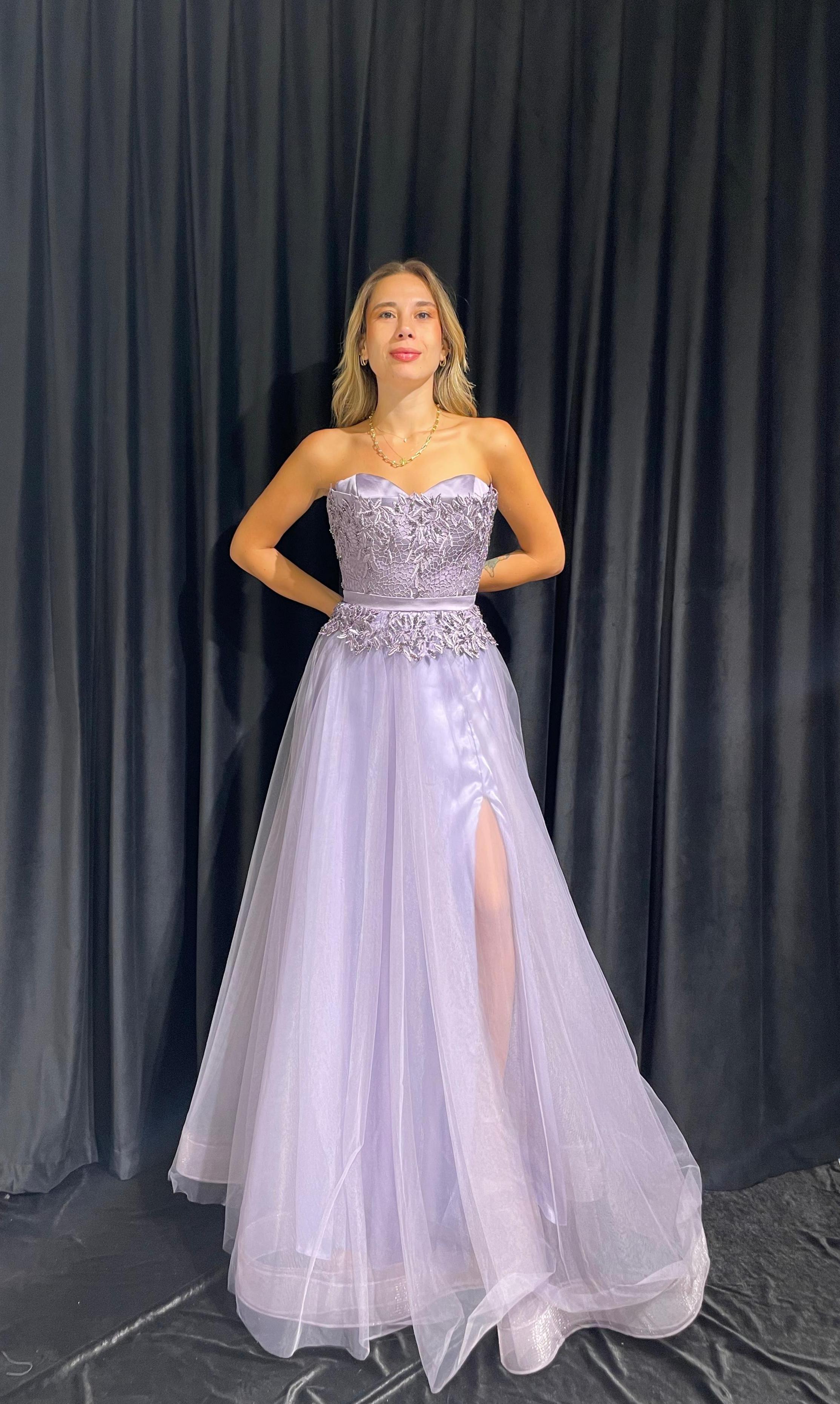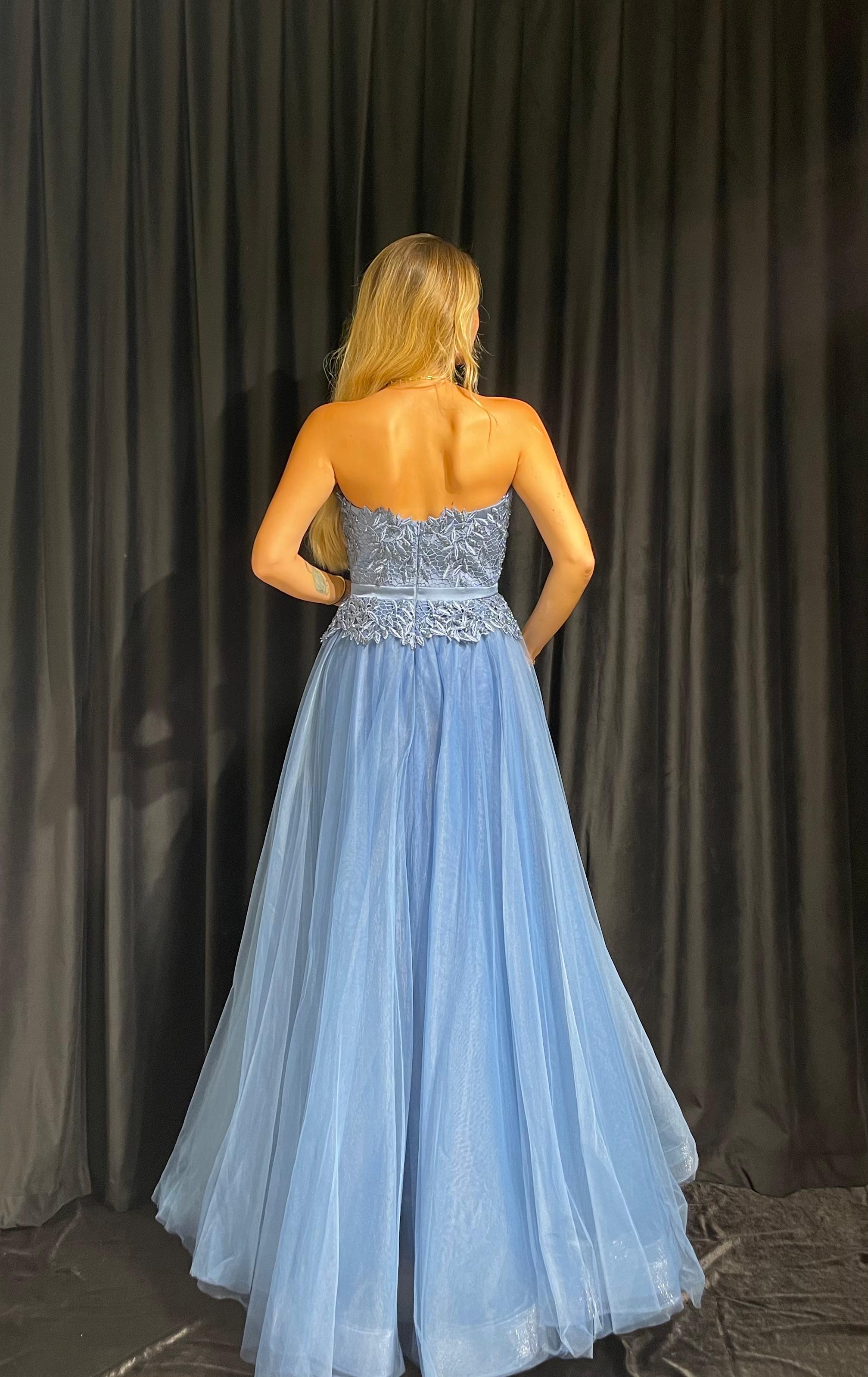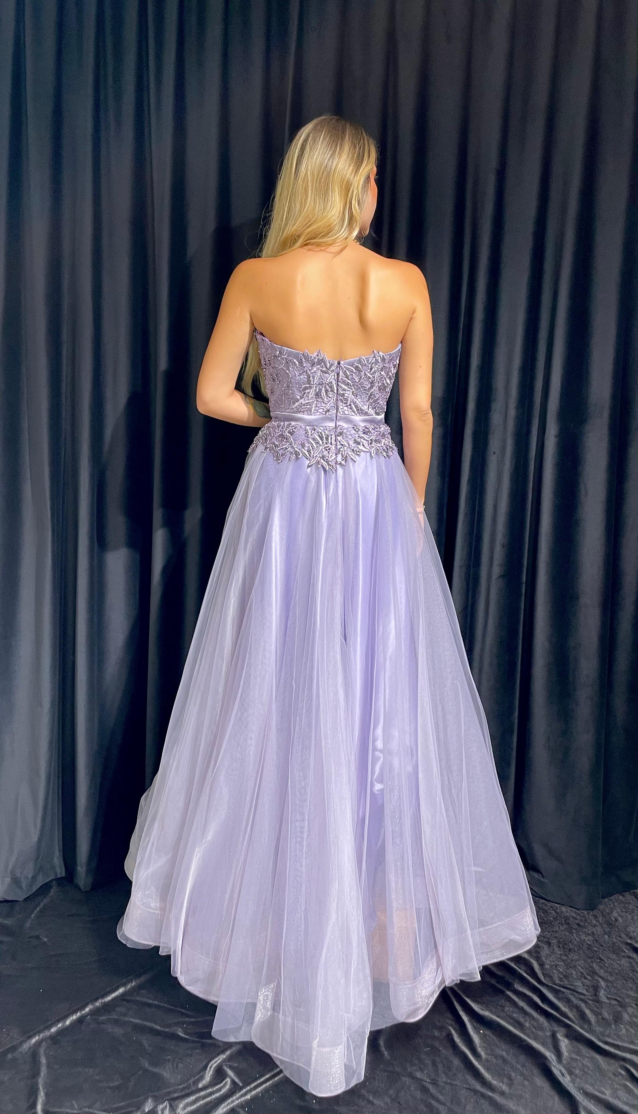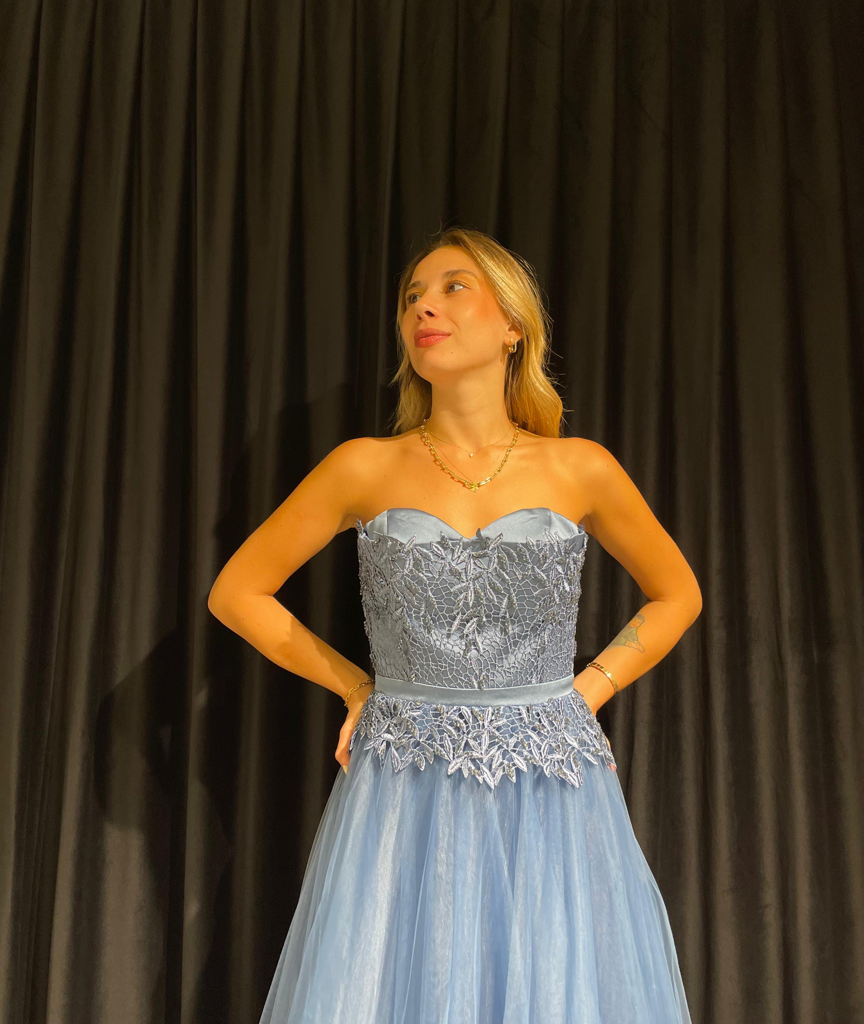 Straplez İşlemeli Gizli Yırtmaçlı Tül Elbise