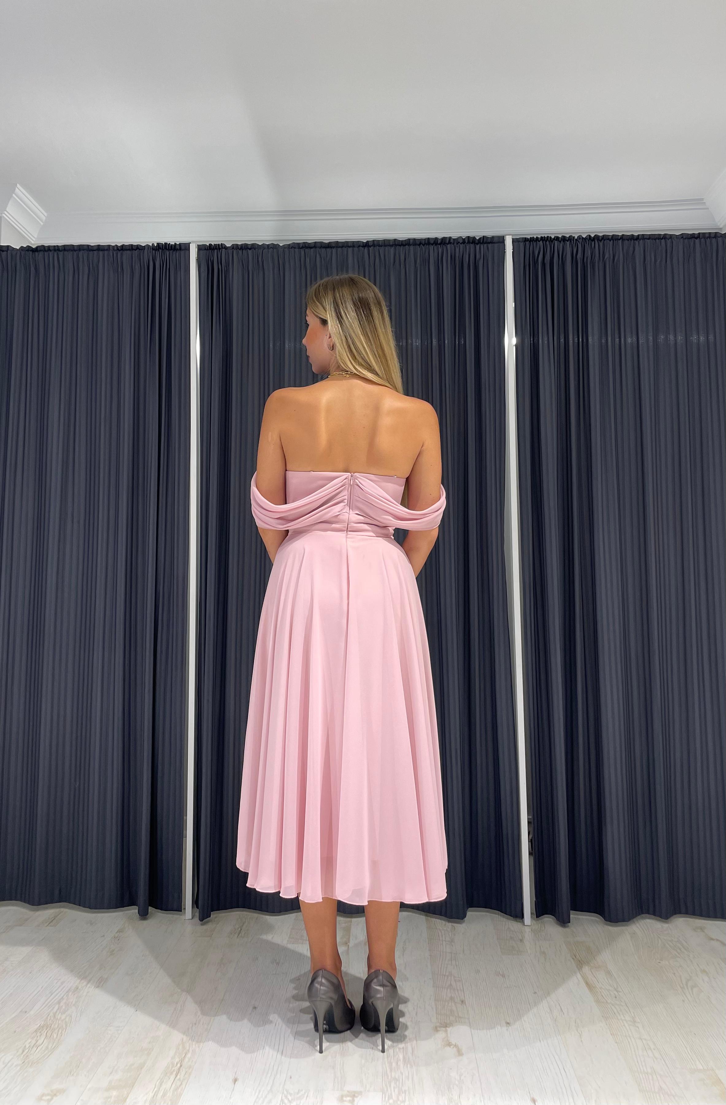 Straplez Prenses Kollu Yırtmaçlı Şifon Midi Elbise, her kadının gardırobunda mutlaka bulunması gereken bir parçadır. Bu zarif ve şık elbise, özel davetlerinizde ve özel günlerinizde sizi prenses gibi hissettirecek.
