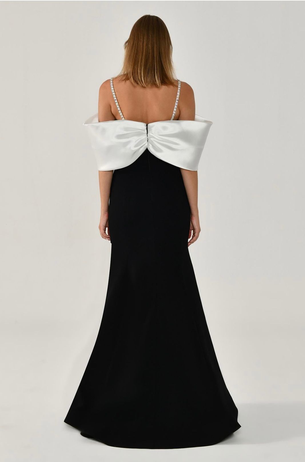 Taşlı İp Askılı Düşük Omuz Krep Uzun Elbise