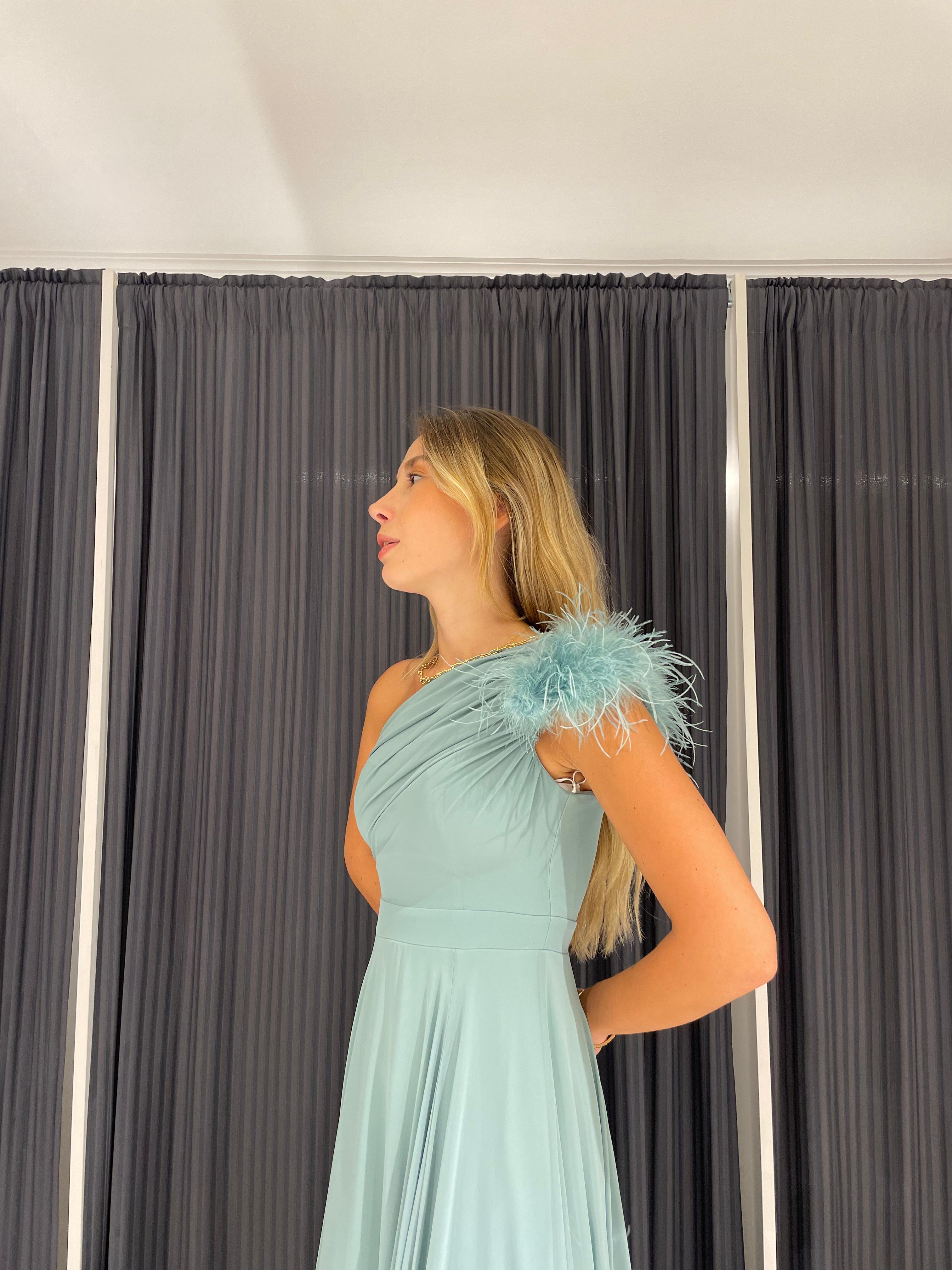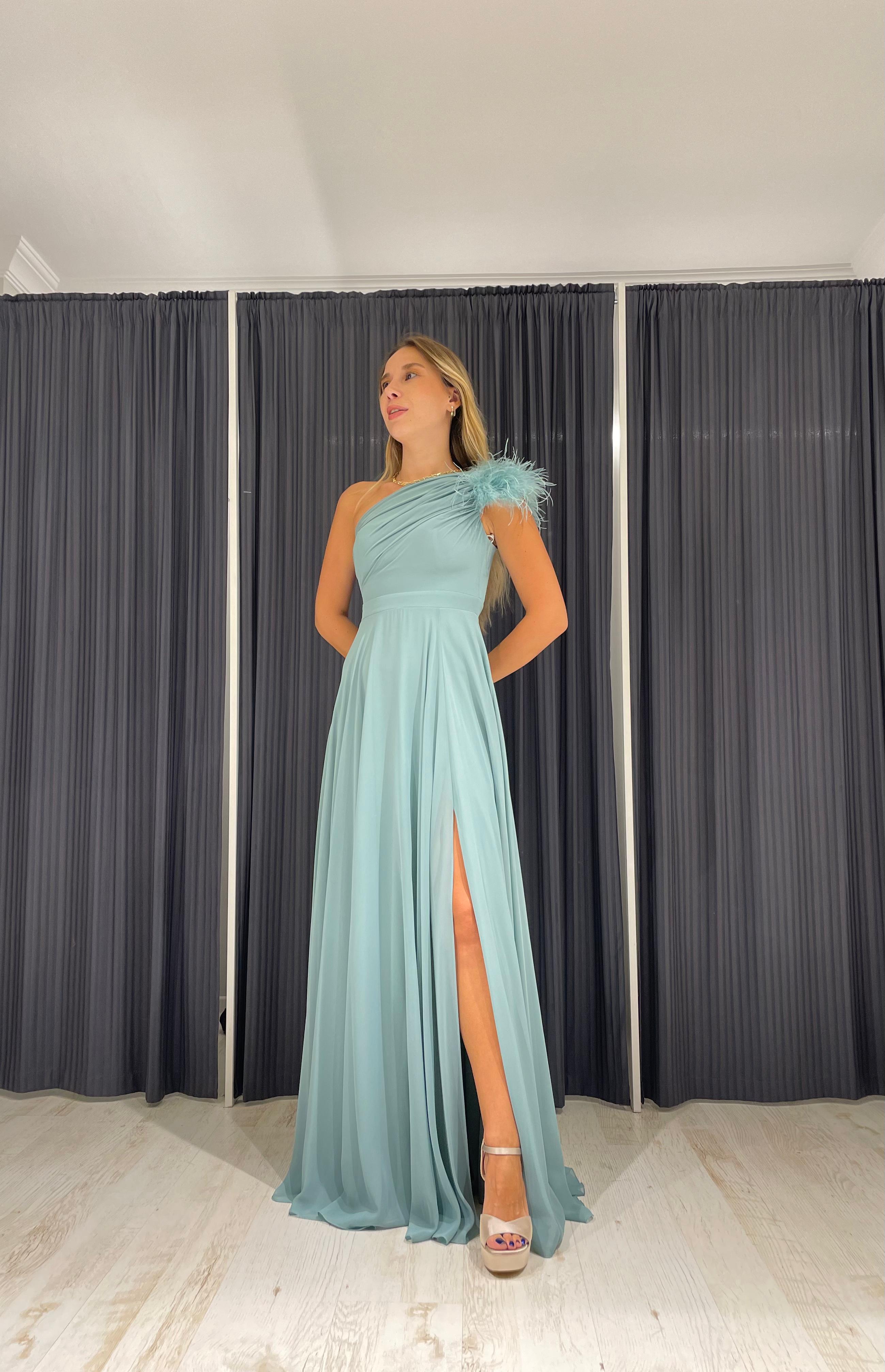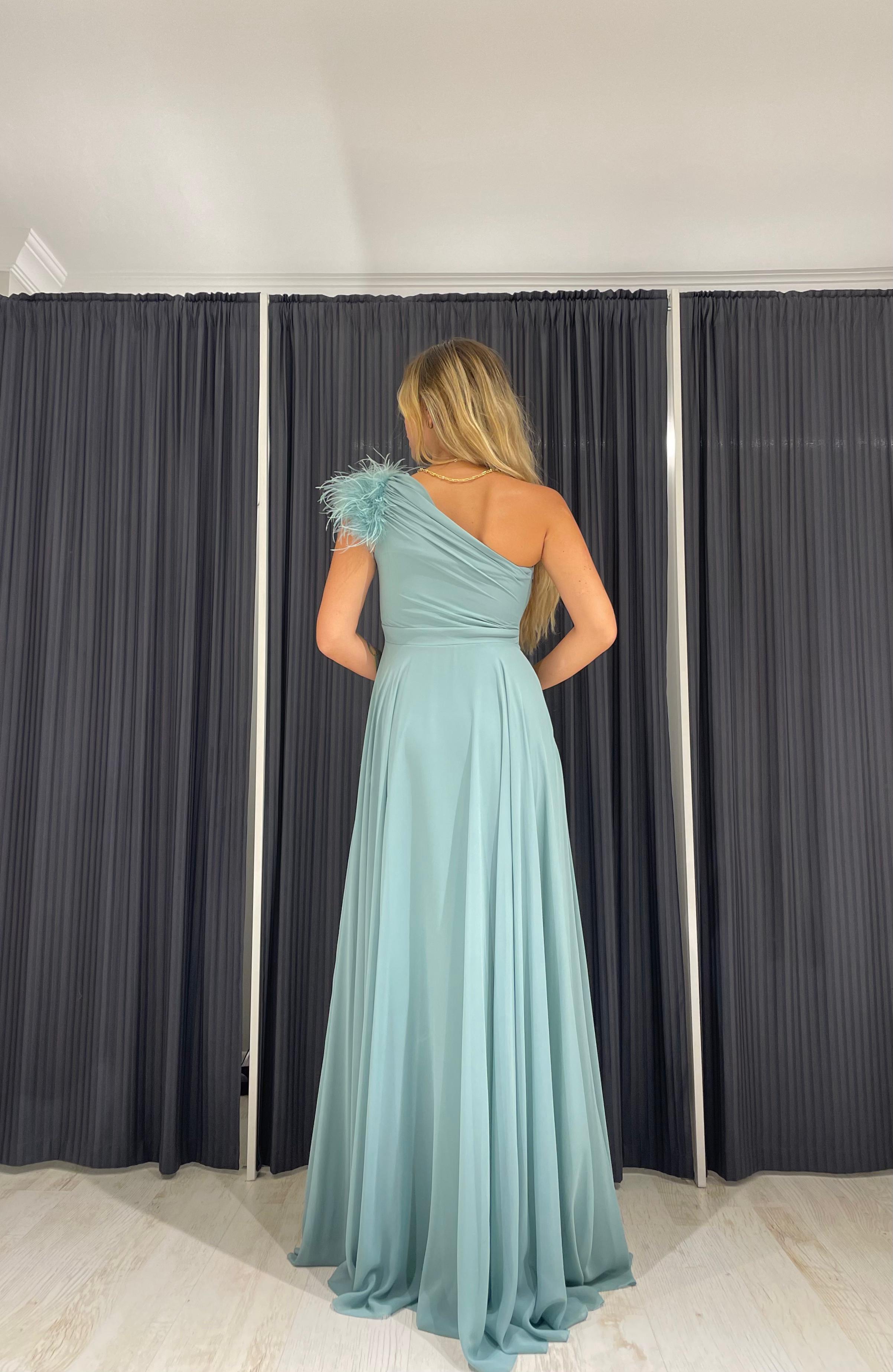 Elbisenin omuz kısmında bulunan tüy detayı, tasarıma şık bir dokunuş katarak size göz kamaştırıcı bir görünüm sağlar.