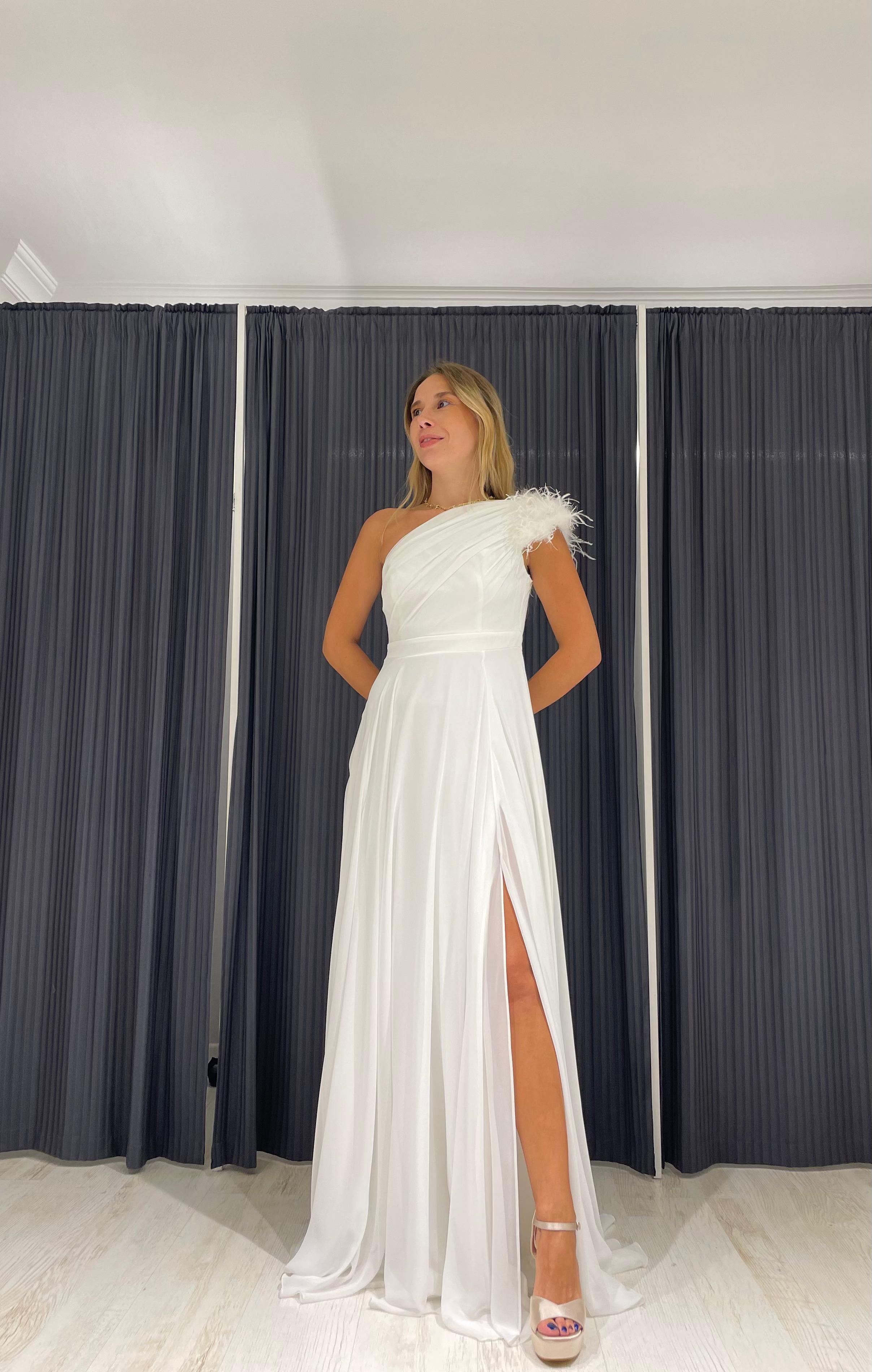 Tek Omzu Tüylü Drapeli Şifon Elbise, zarif ve feminen bir görünüm için tasarlanmıştır. Elbise, yüksek kaliteli şifon kumaşıyla üretilmiştir ve omuz kısmında yer alan tüy detaylarıyla göz alıcı bir tasarıma sahiptir.