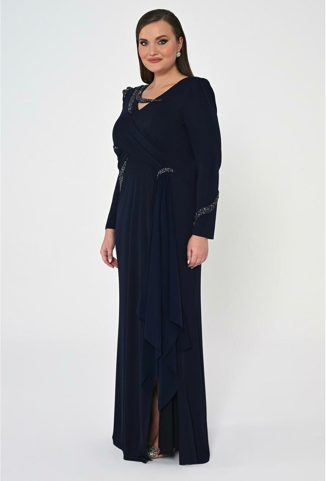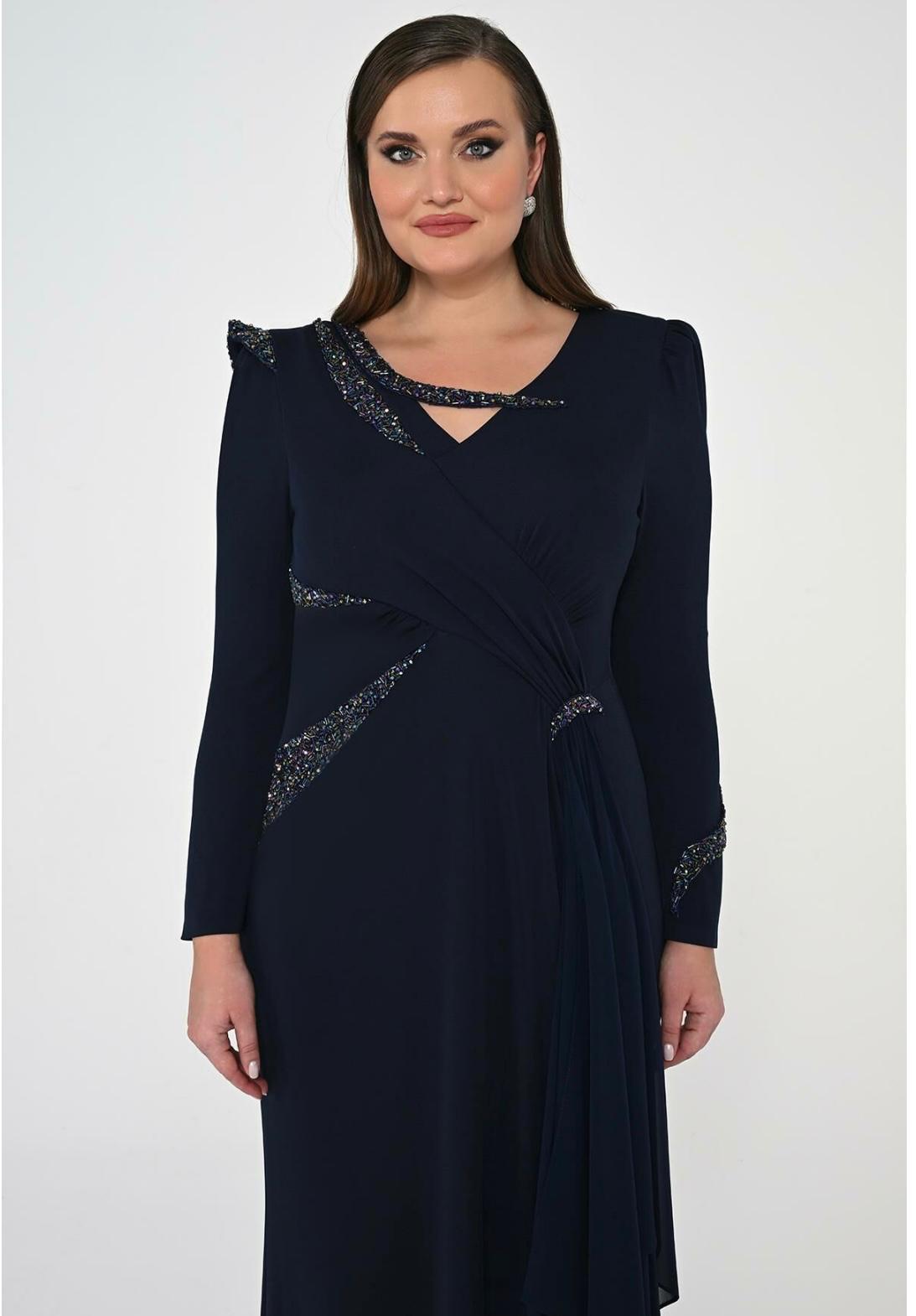 Uzun Kollu İşlemeli Payetli Krep Uzun Elbise