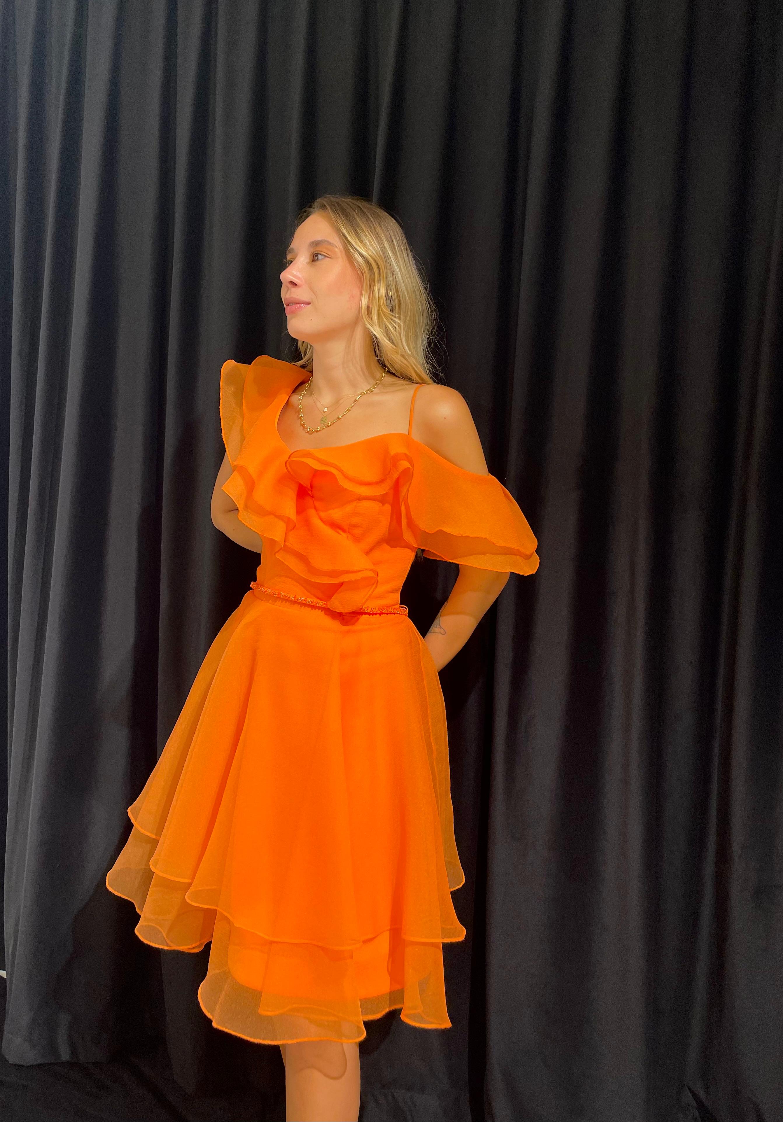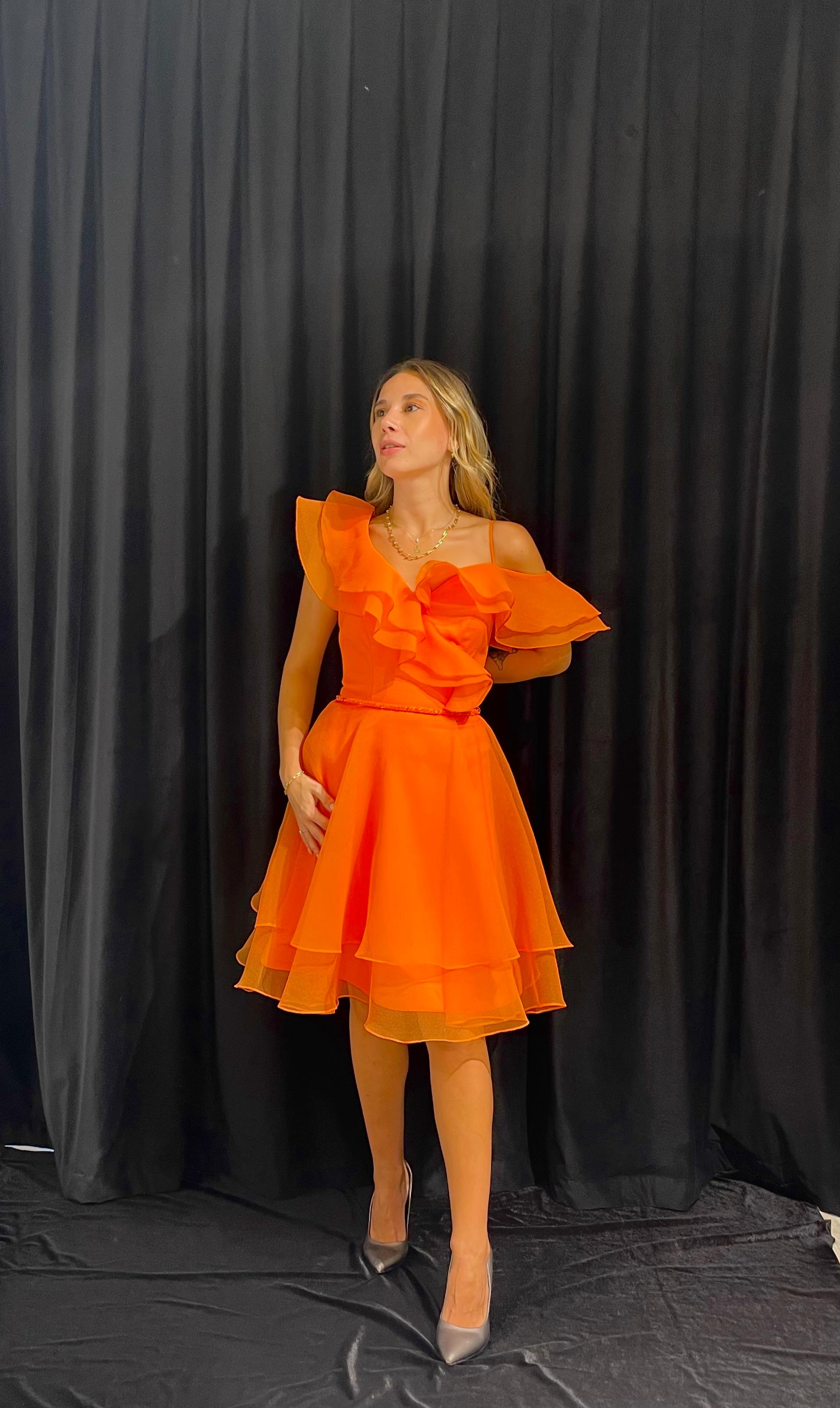 Volan Omuz Detaylı Midi Tül Elbise