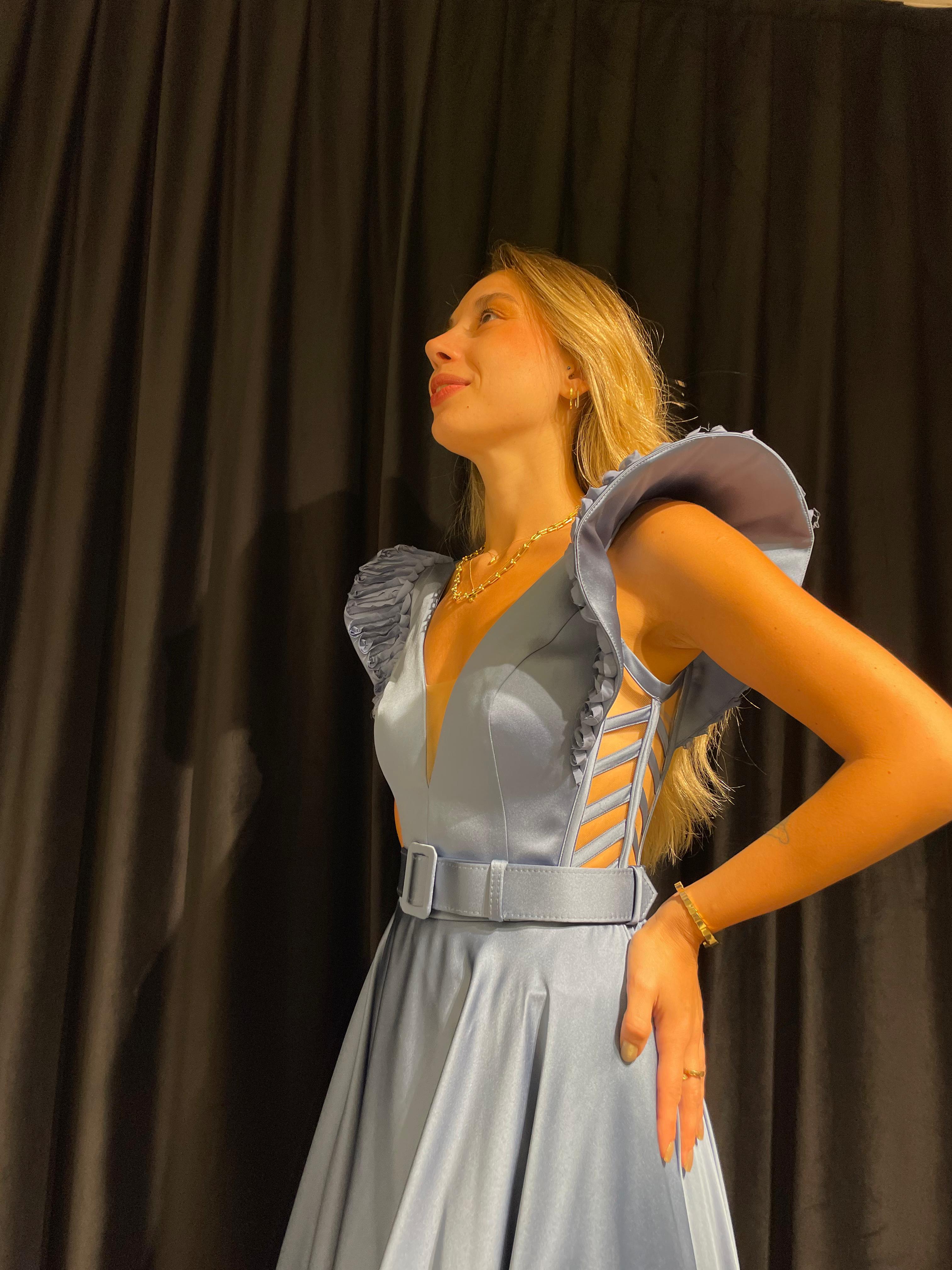Yüksek Omuz Detaylı Kemerli Saten Elbise